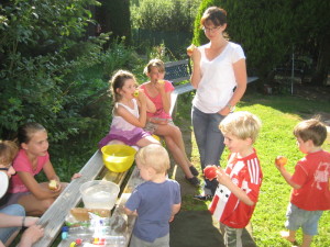 Seit vielen Jahren schon treffen wir uns zum Zelten und Grillen im Garten von Axel. Auch am 11.08.2012 waren wir eine große und lustige Runde. Ich habe ein paar Spiele wie z.Bsp. Apfeltauchen, Dosenwerfen, Kerzen ausschießen und Mohrenkopfwettessen vorbereitet. Wir haben viel gelacht und hatten eine Menge Spaß. Um die Belohnung „Überraschungsei“ zu bekommen, hat jeder etw. vorgetragen. Selbst unser kleinster, Felix, hat uns ein Gedicht vorgesagt. Andere haben ein Lied vorgesungen und wieder andere haben uns einen Witz erzählt.
